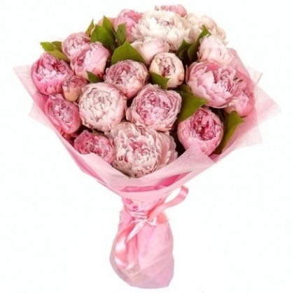 Роскошный букет из пионов с добавлением салала в натуральной упаковке. Такой букет подойдет для настоящих цеителей пионов.