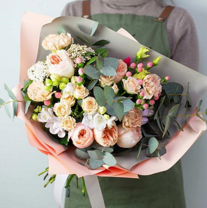 Букет, состоящий из пионовидных и кустовых роз, гвоздик, фрезий и лизиантусов - красивый и стильный, заметно выделяющийся на фоне других букетов. Пионовидные и кустовые розы придают букету великолепный и красочный вид, создают магический и завораживающий эффект. Гвоздики и фрезии добавляют нотку свежести и яркости, а лизиантусы придадут букету изящности и изысканности.